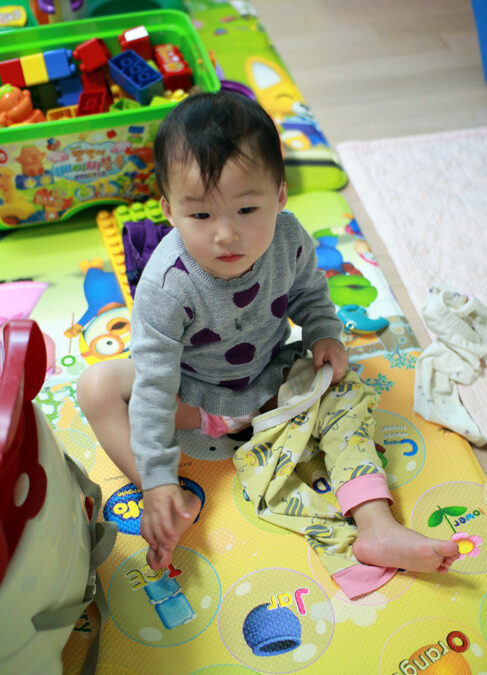 다인이의 바지 위에 바지 입기 시도..